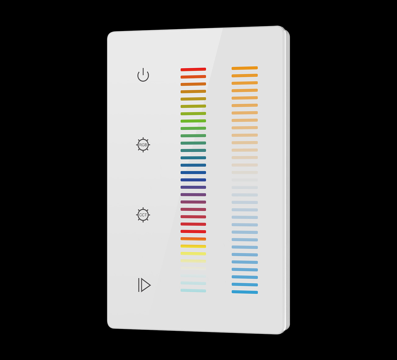 The DMX Touch Wall Controller RGBTW 12V or 24V DC is used to control the color mode, speed, and brightness of both Radialux® RGB and RGBW tape lights. Featuring a touch-sensitive glass interface, this controller can also be used to adjust the tuning range of our tunable tape lights and is compatible with DMX decoders for hard-wired DMX color control. This controller is powered by our Non-Dimmable Drivers.