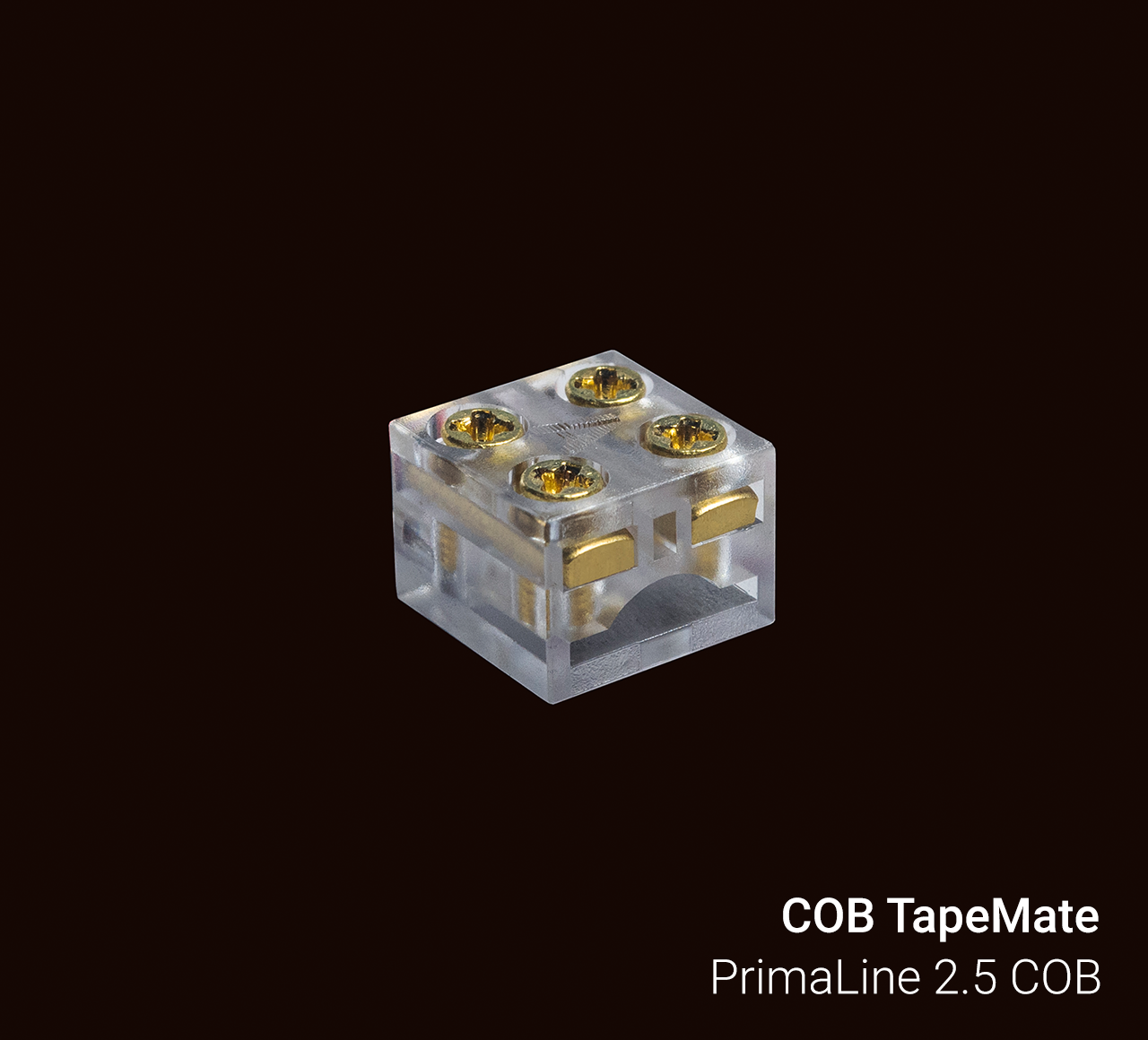 The compact, capable, safe, and versatile TapeMate LED tape light and wire connector provide secure connections between LED tape light sections, between tape light and wire, or between pairs of wire leads. Tapemate is made of a durable, clear plastic that prevents cracking and is pre-installed with 3M VHB tape making installation quick, easy, and long-lasting.