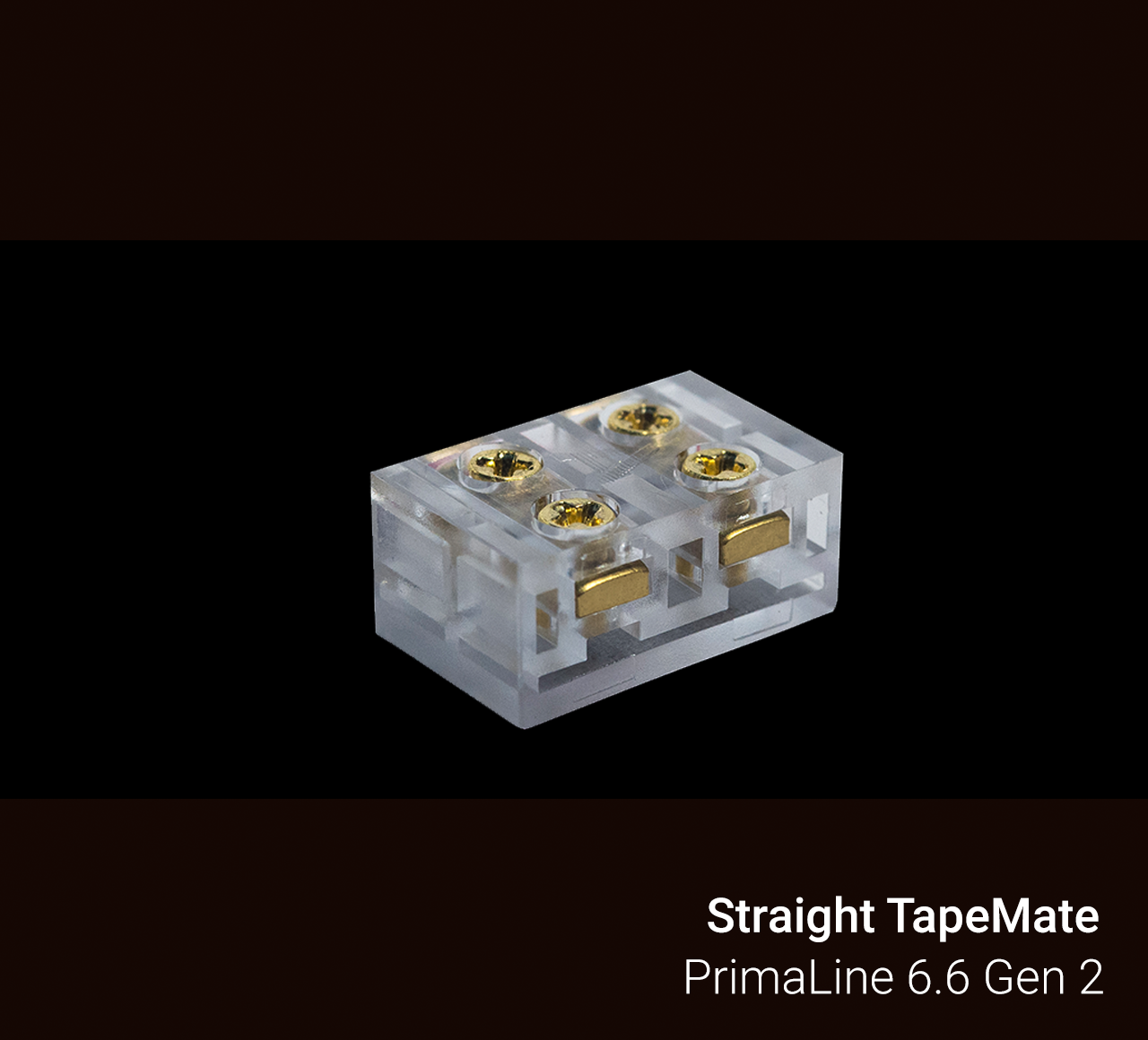The compact, capable, safe, and versatile TapeMate LED tape light and wire connector provide secure connections between LED tape light sections, between tape light and wire, or between pairs of wire leads. Tapemate is made of a durable, clear plastic that prevents cracking and is pre-installed with 3M VHB tape making installation quick, easy, and long-lasting.